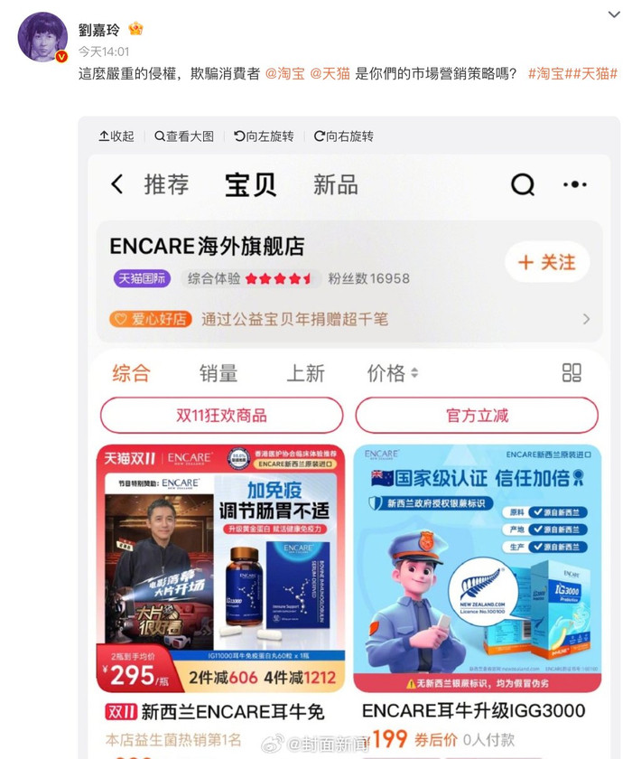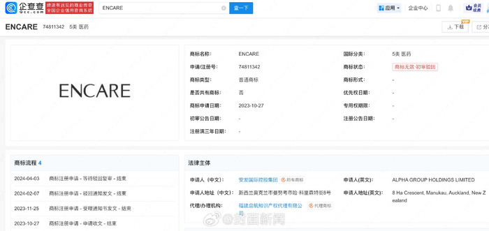 值得注意的是,当前该网店首页梁朝伟宣传大图已撤,店铺已显示“关店”状态,据刘嘉玲发文仅过去2个小时。此外据企查查信息显示,“ENCARE”曾被申请注册为商标,其中安发国际控股集团申请的医药分类初审被驳回目前为无效状态。
