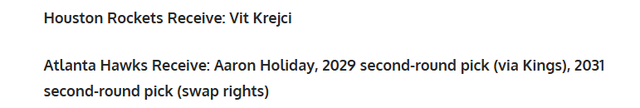 美媒《fadeawayworld》给出的交易方案:火箭送出小霍勒迪,一个二轮签,一个二轮签互换权,从老鹰得到克雷伊奇。